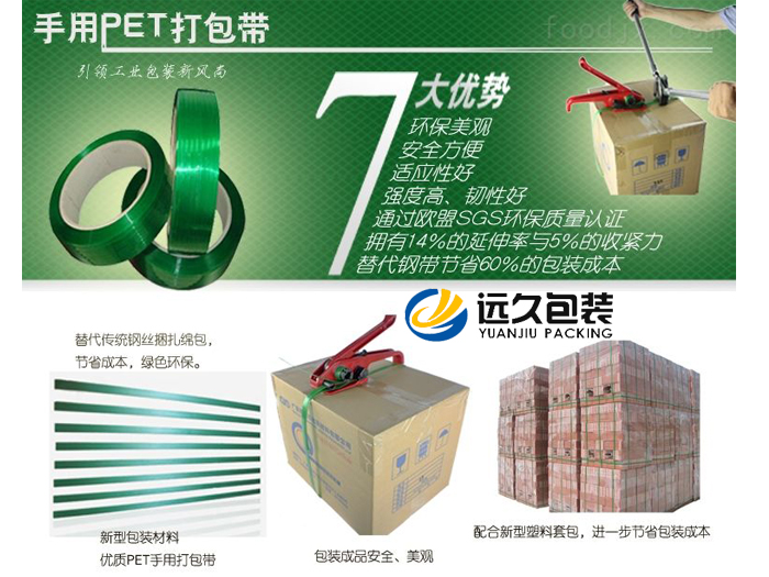 環保美觀:PET打包帶捆扎好貨物后外觀美觀,具有防生銹、防水、抗腐蝕特性,不會對包裝物造成污染,完全符合歐盟ROSH等環保指令,包裝后出口無限制。