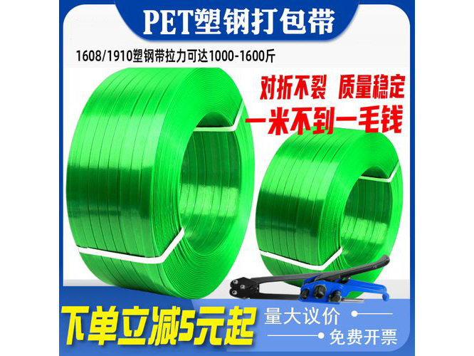 PET塑鋼打包帶又稱聚酯捆扎帶,英文名為“PET strap”,是一種以PET(礦泉水瓶的原材料)為主要原材料經特殊工藝加工而成的高強度、高拉力的新型塑料打包帶。PET打包帶具有與鋼帶同樣的強度和拉力,保持了塑料制品的延仲性和收縮性能,確保貨物在受到外力沖擊下避免斷帶散包的情況出現。